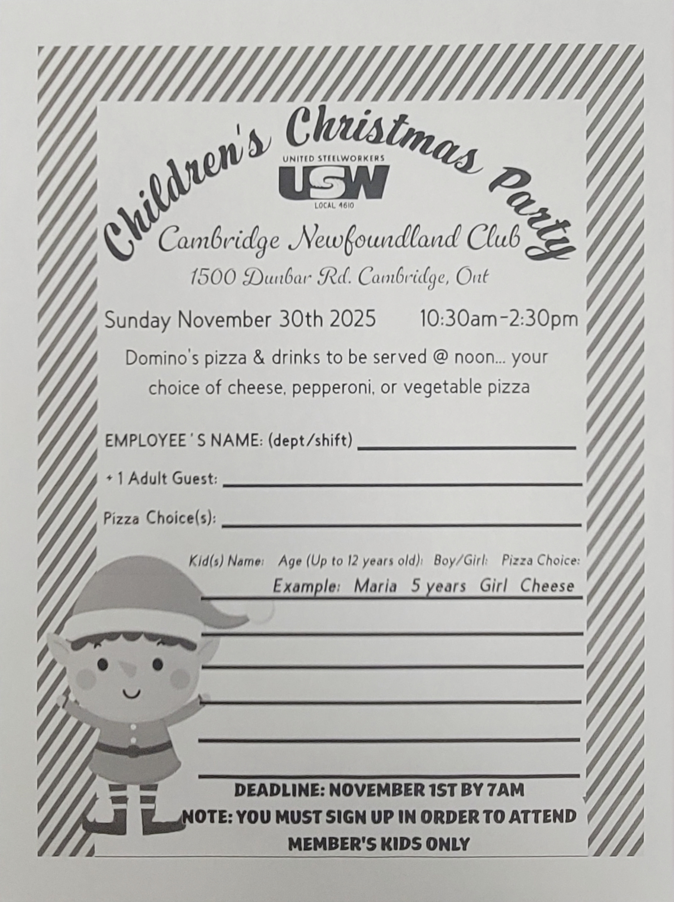 USW Local 4610 Children's Christmas Party 2025 being held on Sunday November 30th 2025. 10:30am - 2:30pm.