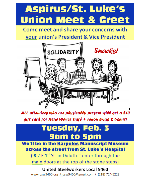 Our union is going to do a Meet & Greet for folks who work at the Aspirus/St. Luke's hospital in Duluth. Our president and vice president will be set up across the street at the Karpeles Manuscript Museum on Tuesday, February 3 from 9am to 5pm. Feel free to stop by before or after work, or on your lunch break, to meet them and share any concerns that you may have. They'll also have snacks, cafeteria gift cards and union t-shirts on hand for anyone who stops by!