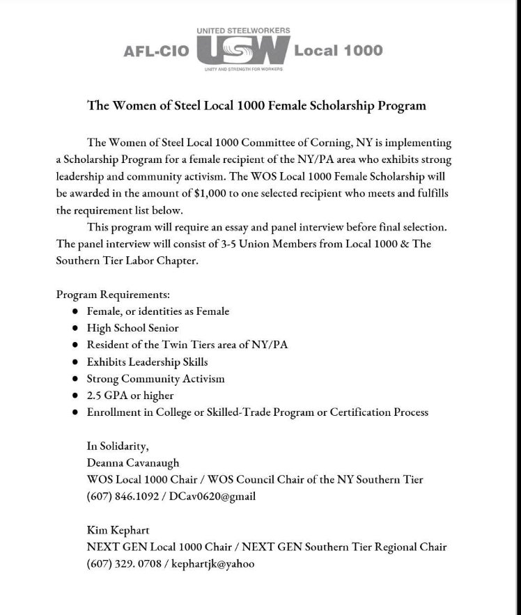2026 scholarship applications are currently being accepted. You can pick one up at USW Local 1000 Union Hall 100 Civic Center Plaza Corning, NY or email Deanna Cavanaugh Local 1000 WOS Chair at deanna6907@gmail.com. Applications are due by May 1, 2026.